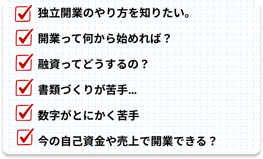 独立開業するにあたり、何から始めればいいのか、どうやって融資を受ければいいのか、何から準備しなければいけないのか、全てにおいて分からないことだらけでした。